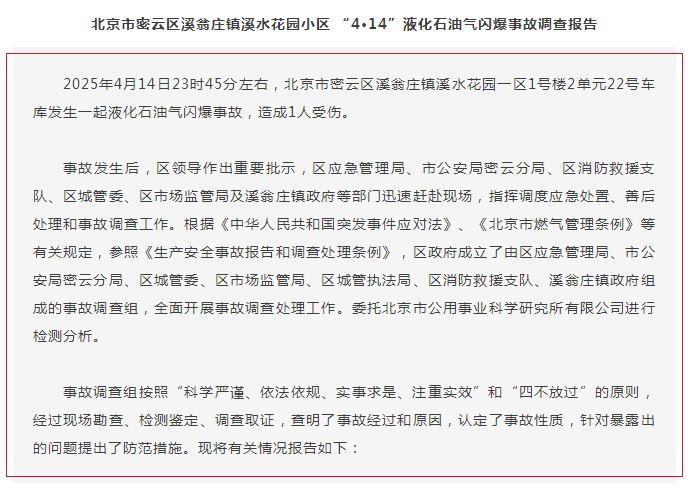【调查报告】北京市密云区溪翁庄镇溪水花园小区 “4·14”液化石油气闪爆事故调查报告